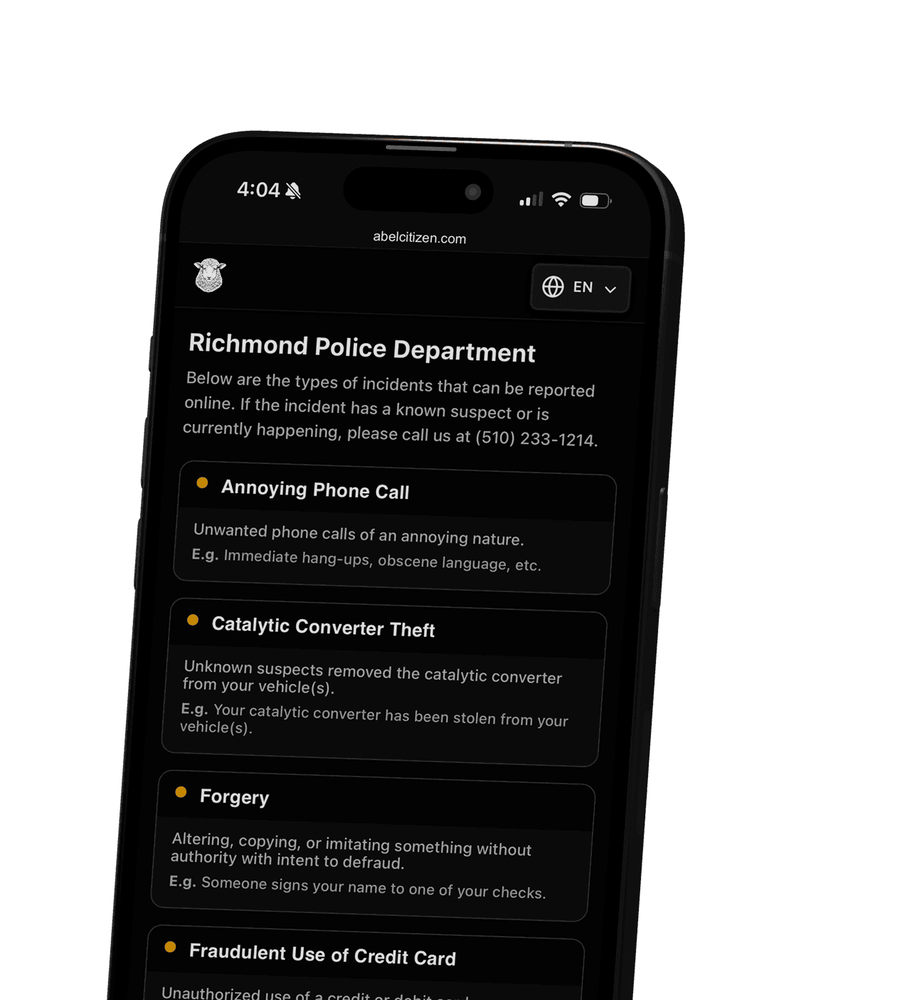 Instead of explaining the multiple steps to file an online report, officers and dispatchers can give one easy domain - abelcitizen.com. Once the user enters the event location, they are routed to your agency’s form.